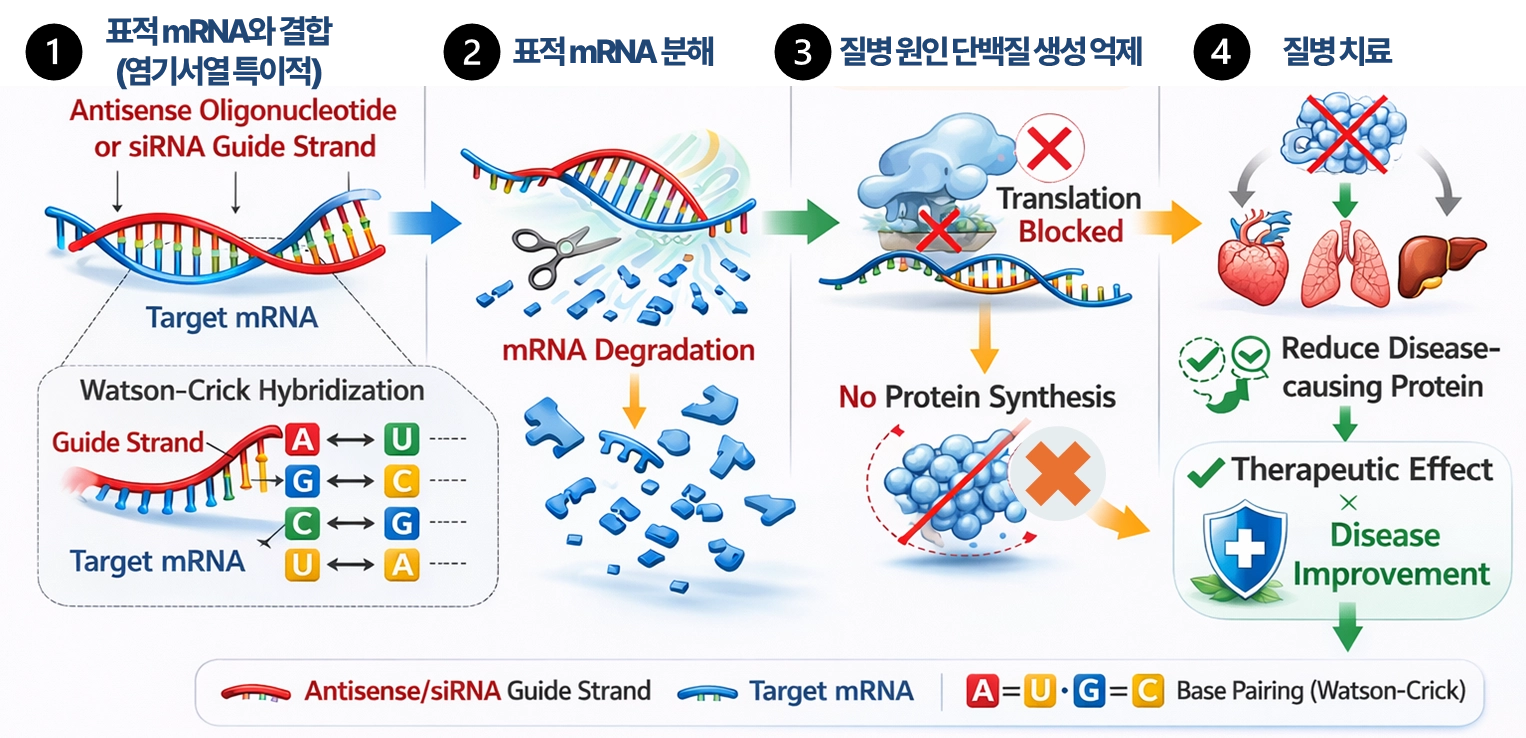 올리고 핵산-표적 RNA Watson-Crick hybridization → 표적 RNA 분해 (RNaseH1 for Antisense, AGO2 for RNA interference) → 질병원인 단백질 생성 억제 → 질병치료