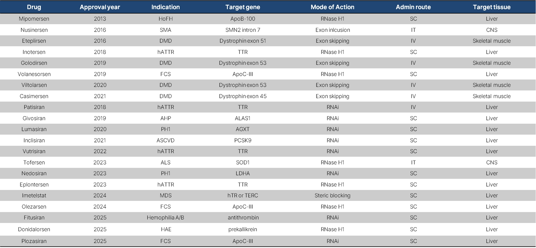 RNA 치료제 혹은 핵산 치료제로 불리는 RNA를 표적하는 올리고 핵산 기반의 의약품